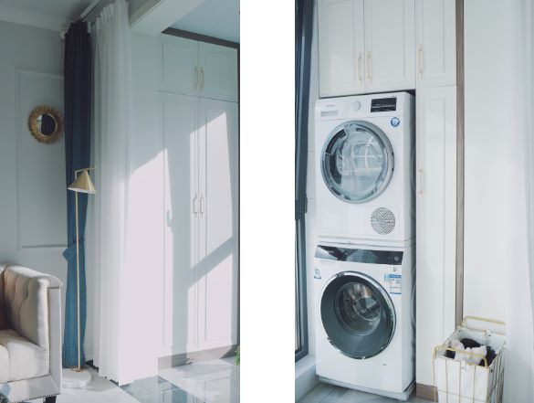 阳台,主设计有个大大的落地窗。落地窗两侧,一侧是洗衣机烘干机,另一侧是一组柜子,专门放鞋。简约干净很耐看,而且实用,洗衣机那侧的柜子可以放洗衣袋、洗衣球之类的。