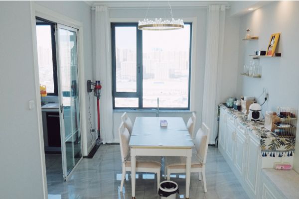 餐厅就更简单一些,基本都是白色系,餐桌也是很简单的白色餐桌+金属色点缀。
