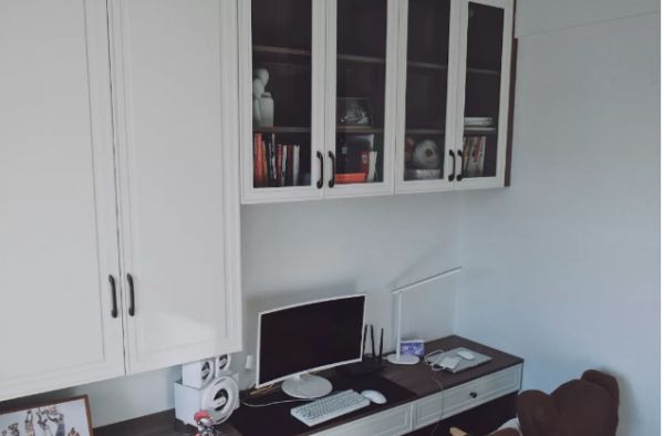 来到走廊的最外侧房间,一个阳面的小卧室,被改造成了书房。书房的色调就是白色+黄色。