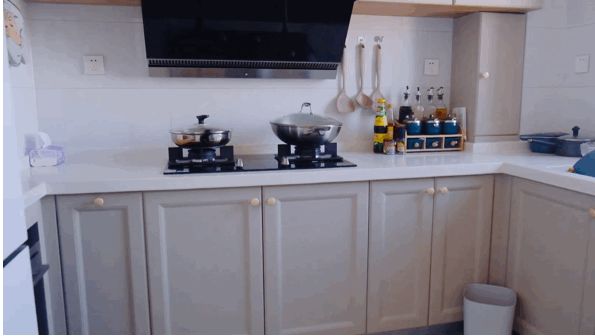 厨房还挺宽敞的,是一个u型厨房。一面是洗菜切菜区、一面是操作区、一面是电器区。