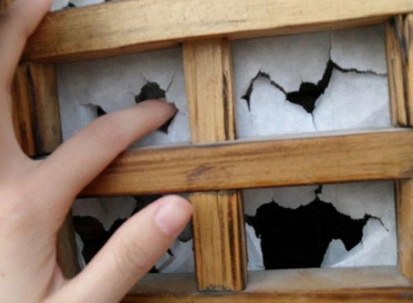这种糊纸的格子窗在北方民居中很常见,糊窗户的纸叫高粱纸,白色,有一定的厚度和韧性,除非故意破坏它,否则是不轻易破的。