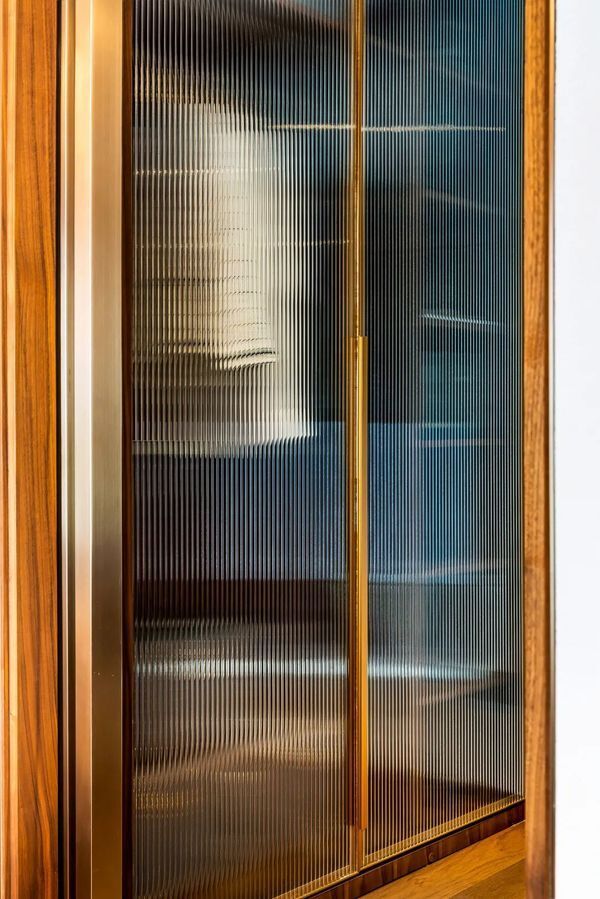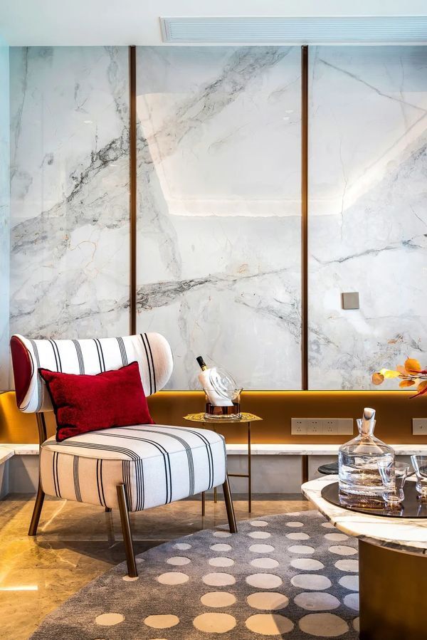 墙面粗细、深浅不一的线条装饰排列,层次跳脱的撞色处理都极具Art Deco精髓,在视觉上呈现一种大气、高雅、通透之感。