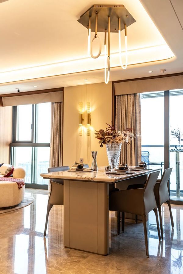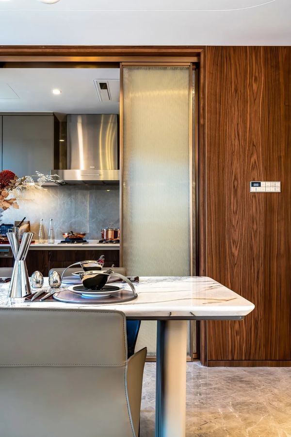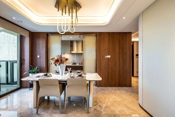餐厅墙面设计为胡桃木硬包效果,呈现极具质感的典雅轻奢,浅色大理石纹餐桌的陈设,层次美感呼之欲出,定格用心生活的每个瞬间。