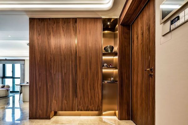 玄关收纳、衣帽间等均延用全屋整装的胡桃木材质,彰显琐碎日常中的生活品质。