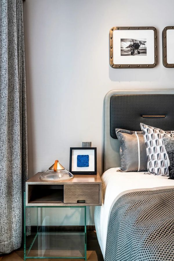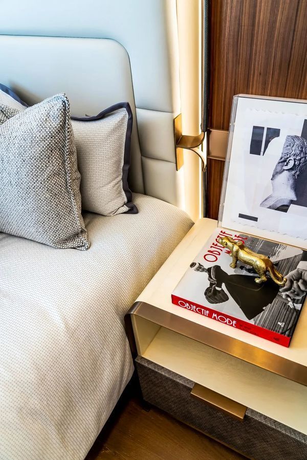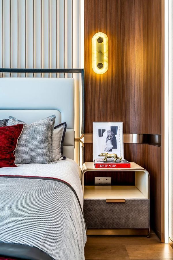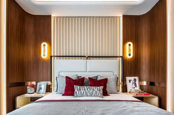 整面胡桃木搭配经典的Art Deco风格的装饰墙,使主卧空间呈现质感奢华的调性;不同材质的运用及细节装饰,为空间拓展出多元的风格谱系,闪耀但不浮夸。
