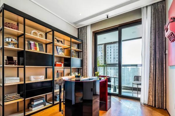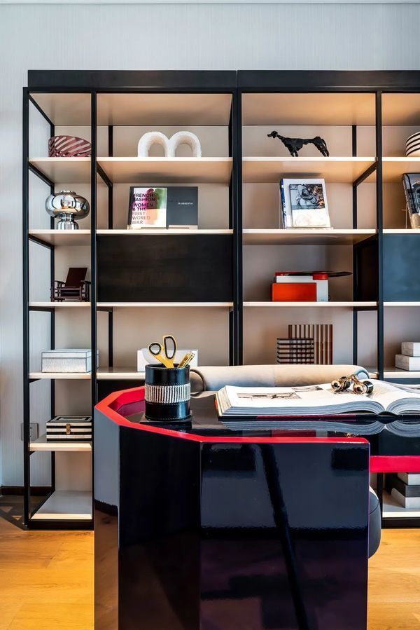 黑色是宇宙的底色,代表安定,而现代派的创新材质运用,却用黑色调和出别样风情。书房中,亚克力质感的书桌与铁铸书架,用黑色红色拼配出现代意味十足。