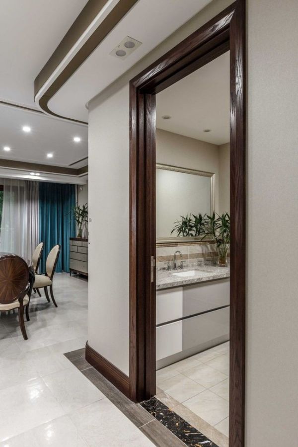 对于卫生间的设计,基本上都认为是污秽之地,所以在设计的时候,都会考虑将卫生间独自隔断起来,这套新中式风的设计效果就考虑的非常周到,采用单扇平开门,密封隔断的效果也非常好,地面还做了门槛石,做了明显的划分区域。