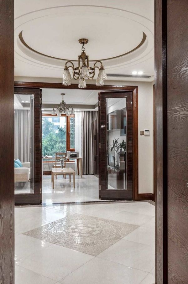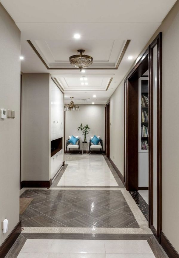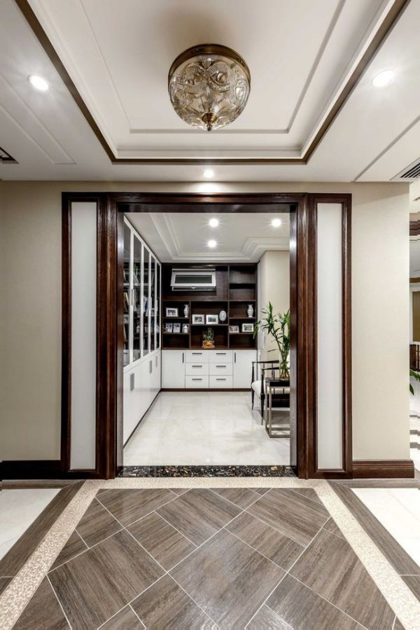 新中式风的设计就是采用非常简单的线条进行装饰,再加以搭配一些比较明显的中式元素,装饰出来的效果。玄关处选择了带有木质纹理的瓷砖进行了局部铺设,墙面搭配的是红棕色的木质边框,将中式风体现得淋漓尽致。
