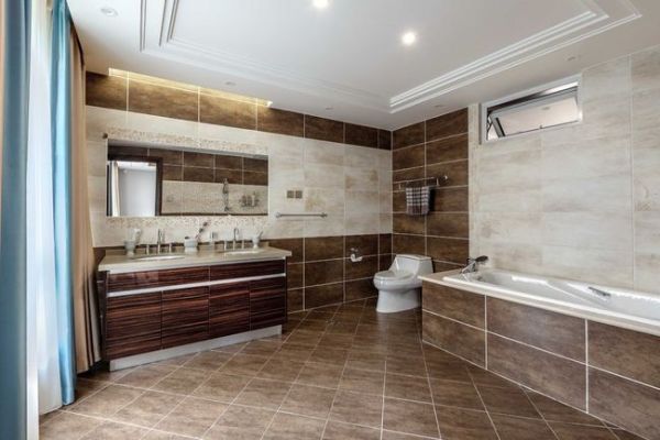 卫生间内部的空间也是非常的宽敞,墙面和地面采用了拼色的瓷砖进行铺设,非常的个性时尚,还做了浴缸的设计,洗漱柜做的也比较大,这样收纳空间也是比较方便的,整个卫生间给人的感觉还是很实用的。