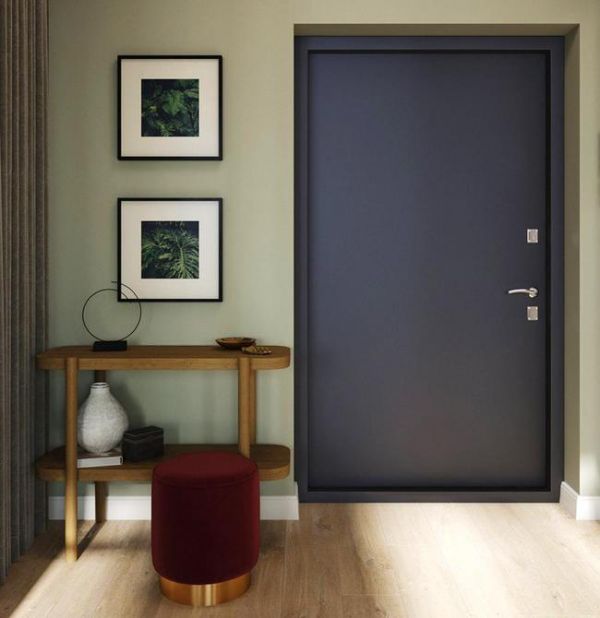 在入户玄关区域,设计师用深蓝色、浅绿色、大红色与原木色的对比,创造出了一个清新舒适又时尚大气的空间环境。深蓝色的入户门搭配上周围浅绿色的墙面,清新中带着一种典雅的气质,好看极了。玄关右侧的双层小桌,让客户进门时可以摆放随手的钥匙、包包之类的物品。大红色的换鞋凳,在整体配色中起到突出、点缀的作用,同时也方便夫妻俩进出门坐着换鞋。