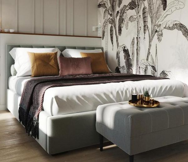 卧室内摆放了一张双人床,让夫妻俩可以更好的休息。卧室与衣帽间之间的隔墙上,设计师用了一幅带植物图案的黑白色墙纸作为装饰,让墙面不会显得单调。