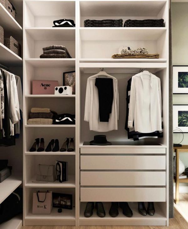 衣帽间内的衣柜,做了无柜门设计,挂衣区、抽屉柜、层板柜让各类的衣物和鞋子可以分类收纳,找的时候也能一目了然。