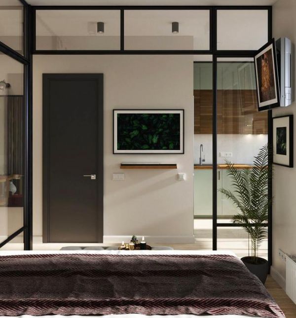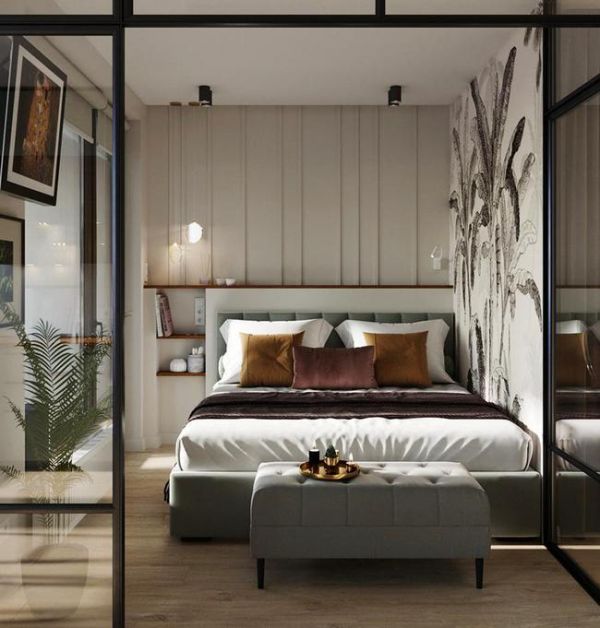 3.设计师用带金属框架的透明玻璃隔出了一间明亮且宽敞的卧室,床头设计层板地带床头柜。