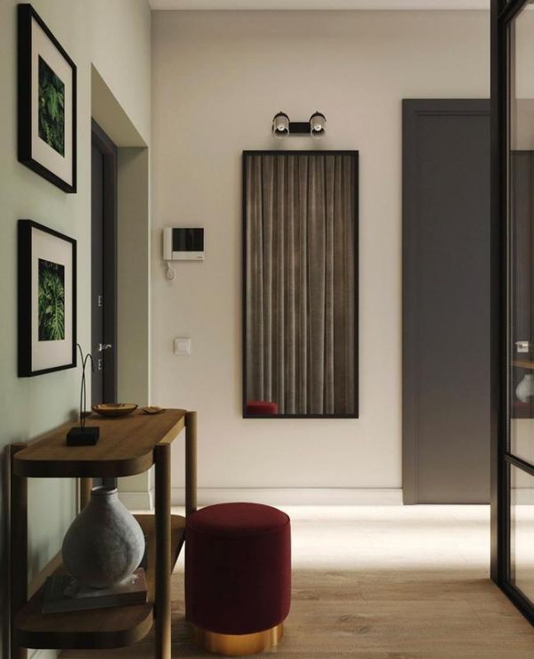 玄关空间和卧室之间,部分用了透明玻璃的隔断,让入户玄关也能有自然光线。玄关旁边的帘子后方,是一个步入式的衣帽间,用帘子替代衣帽间的门,无论是实用性还是色彩,都非常实用,还能让家居氛围更加柔和。