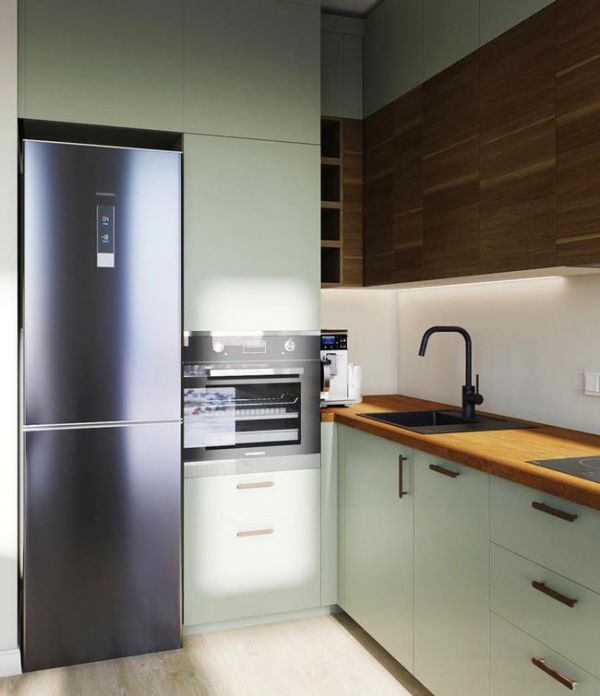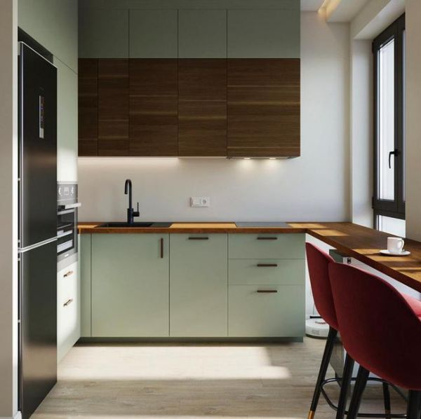 厨房内,沿窗户边设计了一组和厨房操作台面水平的吧台,既作为餐厅,也作为工作区,还可以成为休闲吧台。厨房中,浅绿色的橱柜呼应着入户墙面的颜色,搭配上橡木颜色的操作台面与吊柜,给人一种自然清新的感觉。