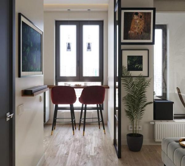 从玄关通过卧室门口的过道,就是家里的厨房和餐厅空间。打开门时,首先映入眼帘的就是窗户边的两张大红色餐椅。