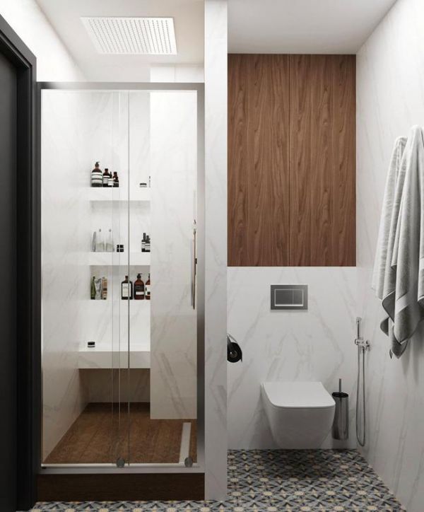 卫生间左侧是淋浴房和马桶区,淋浴房内,利用墙面和下水道柱子之间的空间设计了壁龛和坐台,方便使用。淋浴房内安装了天幕花洒,让夫妻俩可以尽情享受淋浴的快乐。马桶是壁挂式的,上方的墙面空间设计了一组隐藏式收纳柜,把热水器隐藏在了柜子中。