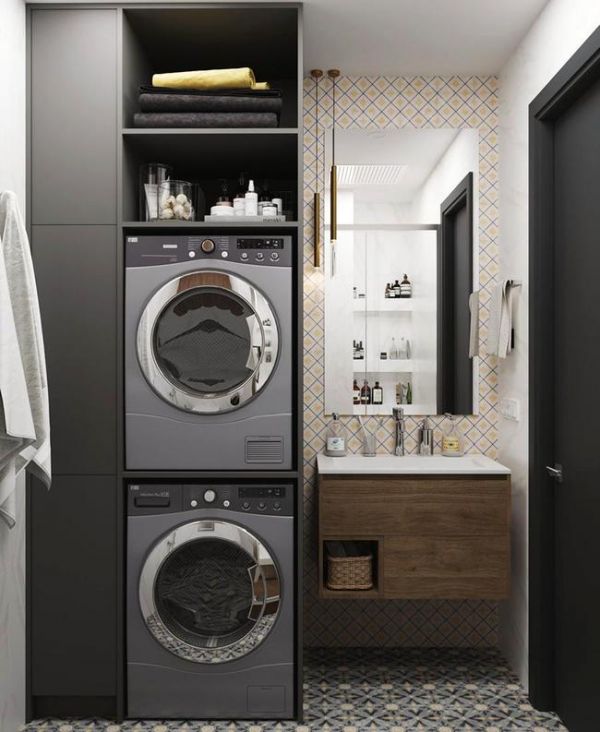 卫生间右侧是浴室柜和洗衣机柜,悬空的浴室柜,防潮且不留清洁死角。洗衣机和烘干机则能让家里避免晾晒的烦恼,衣服洗完后直接用烘干机烘干。洗衣机柜旁边还设计了一组收纳柜,增加卫生间的收纳空间。