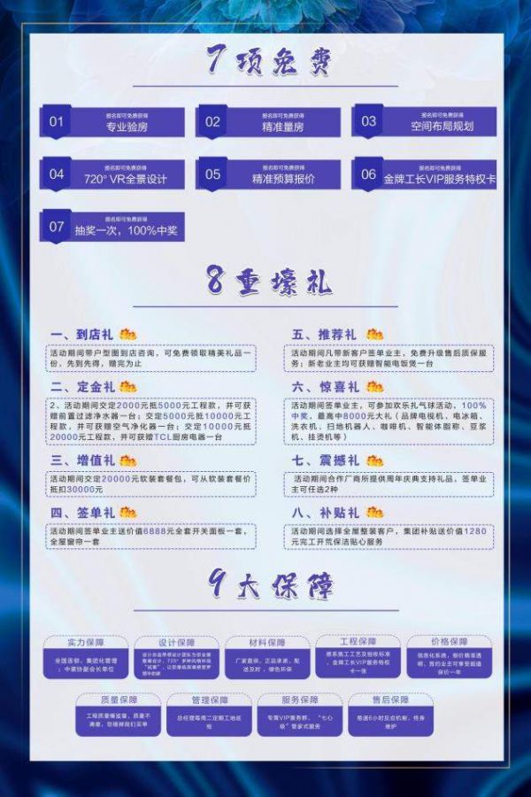8、补贴礼: 活动期间选择全屋整装客户,集团补贴送价值1280元完工开荒保洁贴心服务