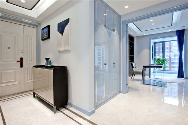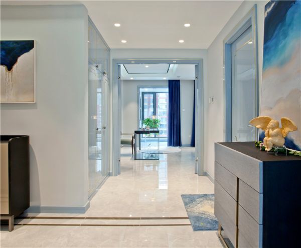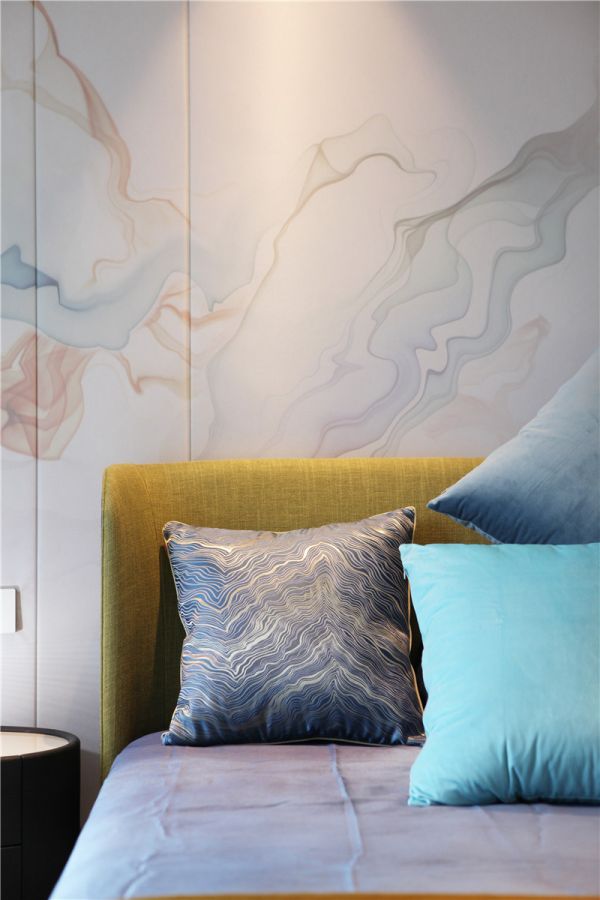 客厅同款背景墙与简洁的吊顶造型线条感极强,拉伸着空间的维度,不同明度的蓝色软装让人陷于静谧的艺术中,营造出平和舒适的睡眠空间,瞬间忘记了时间。如果说光影成就了空间的艺术感,那么艺术本身则丰富了空间的格调。