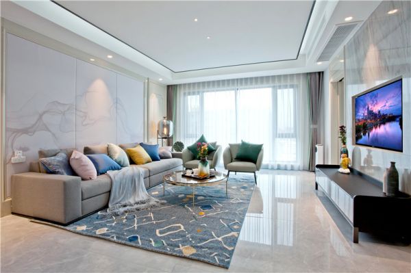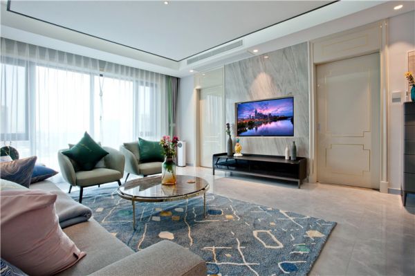 客厅动线经过重新布局,如画般的美景与灿烂的暖阳透过大面积落地窗轻盈而柔美地洒落进每一个角落。沙发背景墙似纱似雾,勾勒出远山般的纹理,简洁却不简单。温柔的米灰色沙发搭配色彩丰富的抱枕,沉静婉约。灰色壁炉墙面则中和了空间的狭长感,又为墙后厨房空间增加了神秘气息。