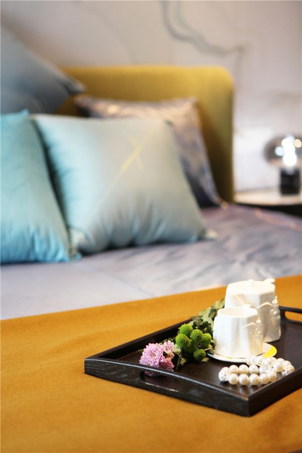 温柔的配色从客厅延伸至卧室,也将这一室的浪漫演绎到极致。主卧格局未作改动,一整面墙的嵌入式衣柜收纳力强大,白底黑框的搭配简洁大方,再搭配艺术气息十足的床品、茶具和造型别致的灯具点缀其间,为这个简约温柔的空间更添了一分精致。艺术便以婉约的姿态融入生活,不是个性张扬,而是润物无声。