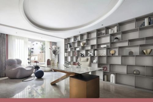 客厅一角的装置艺术摆件,恰如少女对一份崭新恋情的憧憬与祈愿,在被爱浸润的时、空里,设计皆由浪漫而柔软的手法予以铺陈:圆形、弧形的定制家具,汇聚一室优雅翩翩的温柔。轻盈质感的水晶、金属饰品,和着糅入地毯里的点点星辰,与点睛的糖果粉色,凝练一场爱与被爱、心跳与喜悦的现代爱情故事。