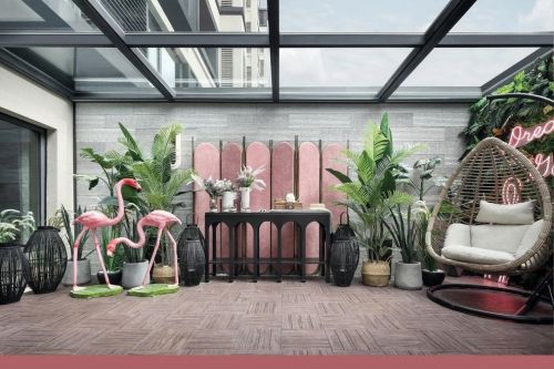 下叠户外花园将少女感进行到底,糖果色与绿色的配搭,青春而生动。通透纯净的湛蓝透过零视线阻扰的天窗恣意洒落进来,人与自然相敬相融,窝在这里,研究星宿变化,感受四季更迭......