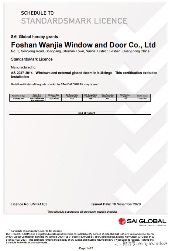 新浪门窗频道讯 近日,万加门窗产品通过了澳大利亚产品质量认证,获得了StandardsMark认证标志。在获得又一项国际标准认可的同时,也意味着万加门窗的国际化水平进一步突破。
