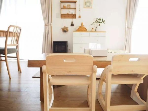 从细节上的家具来看,选择的也是原木的桌椅,和原木的地板,以及墙壁上的原木挂件,从视觉上形成相互呼应的效果。