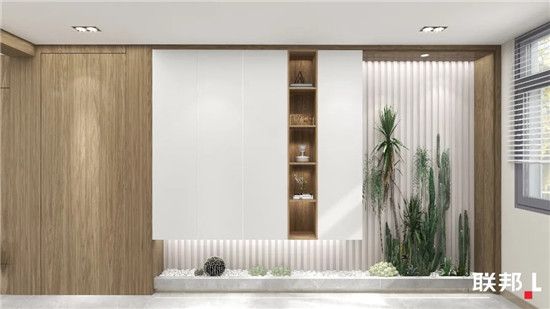玄关区域在白色的基调下,使用了大量的木质元素护墙板、隐形门到定制柜,木材温润的色泽给空间带来质朴的舒适感, 结合大理石台上的绿植景观带来的生机,营造了一种轻松的生活方式,增添室内的温暖与舒适。