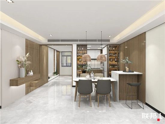 半开放式的餐厨空间,利用墙体做成定制酒柜,既可装饰,又可储藏。公共空间的开敞通透,是空间的渗透,也是融合。餐桌旁设置了同色系吧台,错落有致,赋予餐厅浪漫情怀。