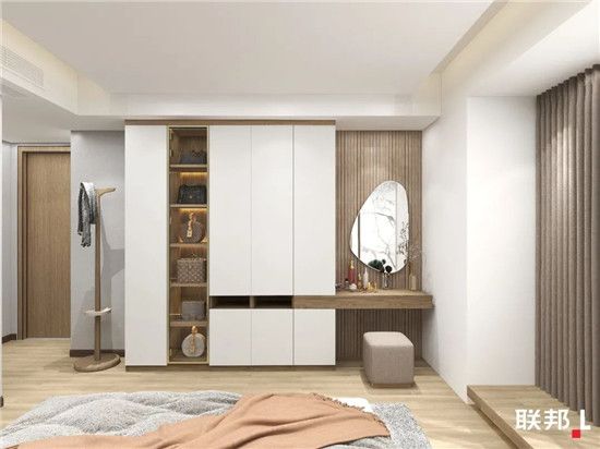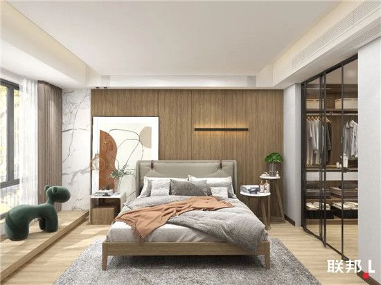 主卧床头用木质墙板搭配大件的简约挂画,不仅空间感增强了,也让枯燥的平面有了动感。