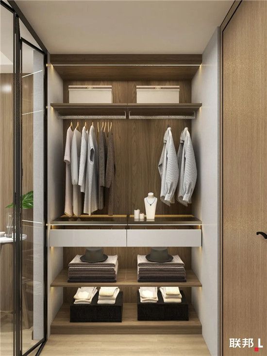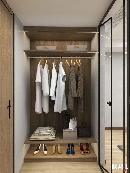 狭窄的衣帽间运用了挂墙式衣柜与黑色拉丝不锈钢框的清玻璃折叠门,衣柜极大减少了可见支撑板的面积,收藏空间大,内部结构分区明确,存取方便、有充裕的活动空间。