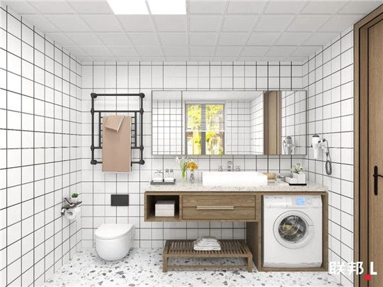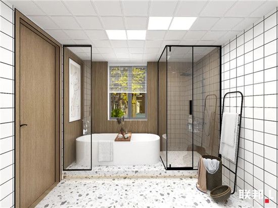 主卫干湿分离,浴缸与淋浴用玻璃隔开,采用大量的白色仿水磨石纹地砖、白色墙砖,使空间明亮了不少。