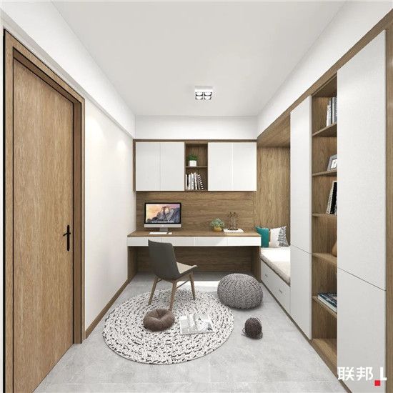 书房以原木色和白色的基调去打造,满墙的木色定制书柜与玻璃窗完美结合,最大程度引入自然光,令空间视觉通透流畅,飘窗形式的定制地柜提供了大量的收纳功能,闲适生活,时时明亮。
