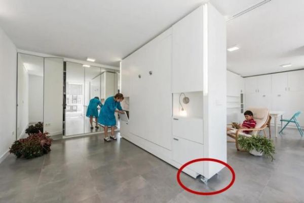 晚上的时候按下按钮,卡座就会向前移动,等到腾出足够的空间就可以停止,直接卡座背面的底部还藏着一张抽拉床,将它拉出来就能睡觉。而原本的柜子也是个双面柜,背面还藏着一个大衣柜,妥妥的就是个“迷你型”卧室。