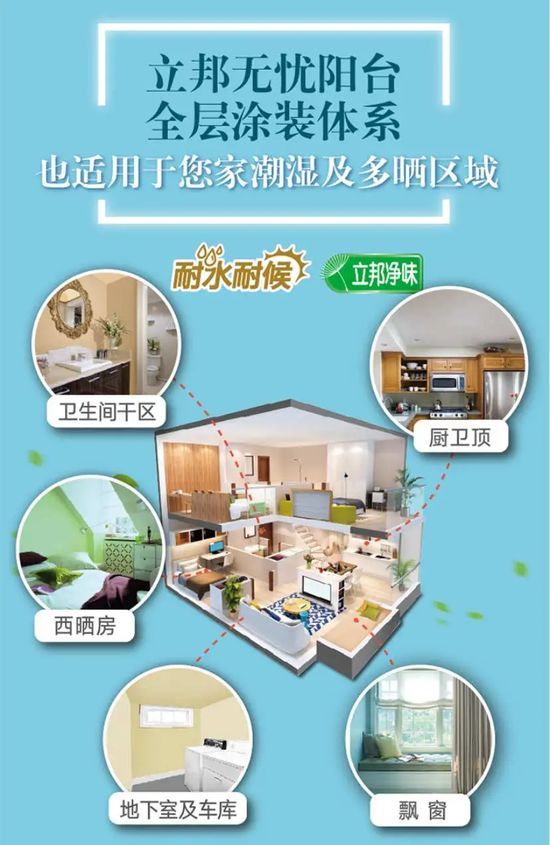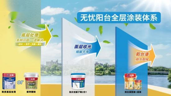 立邦无忧阳台全层涂装体系针对潮湿、多晒区域特别研发,由底到面,长久保色,抗霉防碱,有效解决并预防阳台问题,告别“抬头是美景,低头是霉点”的阳台。