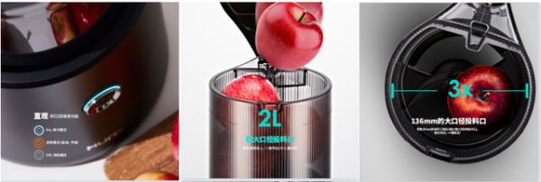 136mm的大口径投料口,比老款45mm的投料口增大了整整3倍!无需切块,只要洗净就可投入整个苹果、整串葡萄、整根胡萝卜等食材,连籽带皮可榨出满满2L的果蔬汁,一次榨汁即可满足全家人的饮用需求!