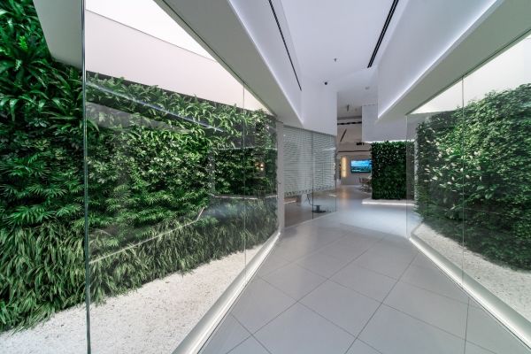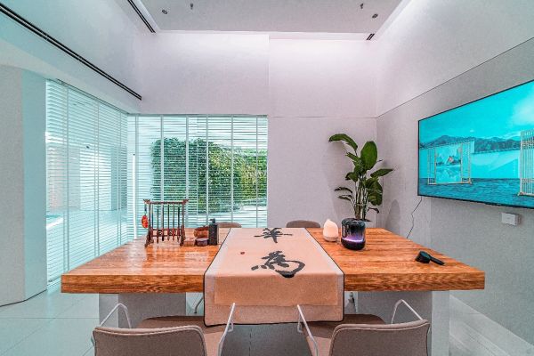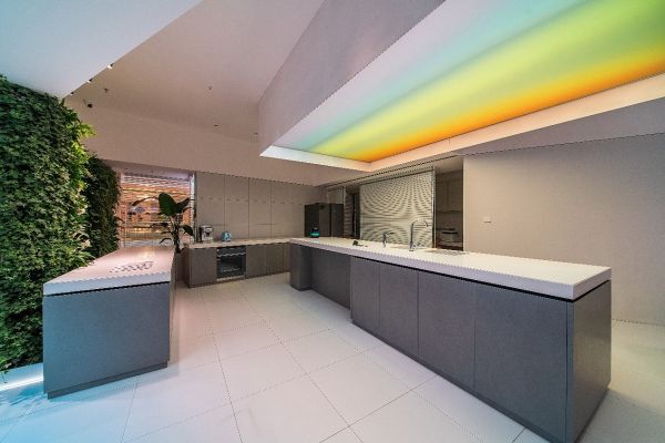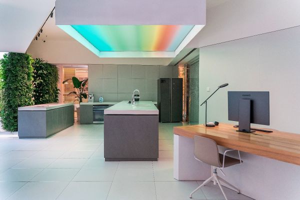 门店位于成都城南富森美家居商场1楼,内外联通,标识醒目。店面总占地达500余平方米,以绿植墙为区隔,划分为运动休闲区、卧室区、书房区、客厅会客区、厨房区等场景模块。为增强客户体验流畅感,充分体现科技未来感,在空间设计上,各区间无规则呈现,使得整体动线曲折,凸显转角有新意之感。此外,不同于其他家居体验店,华为全屋智能成都富森美店摒弃了样板间式的实景铺排,全面聚焦于智能体系的应用与感知,通过华为智慧屏和随心而变的氛围营造,精准映射智慧家的模样。彰显未来家不止所见,还拥有更多的可能。