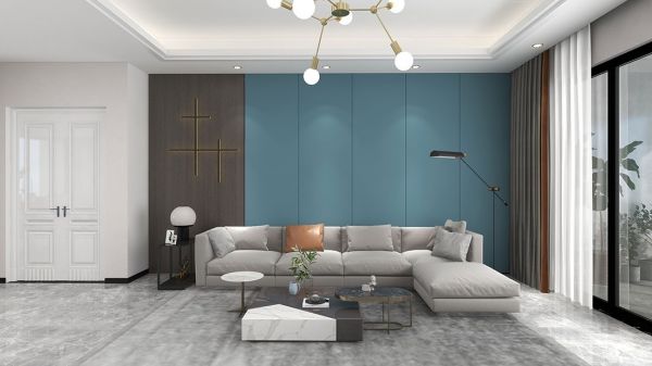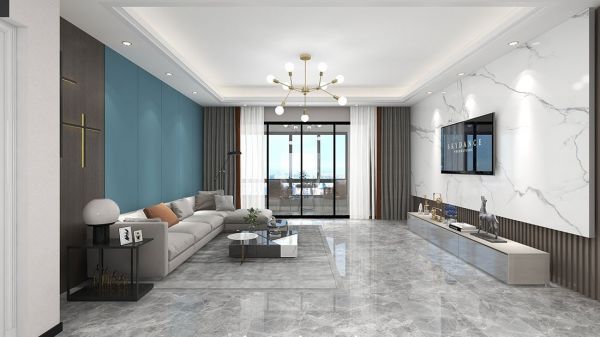 客厅的地面使用了瓷砖,给人以清丽空旷的感觉。沙发背景墙采用了天洋墙布,同时做了简单的线条包边,使用了经典的蓝色,无论是色彩的搭配还是线条的错落,都丰富了层次感,搭配落地窗及拼色窗帘的设计,极大的拓展了客厅的空间感。