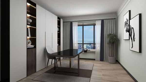 书房对光线和隔音的要求比较高,所以墙面装饰也是选择了简单的浅水绿墙布与装饰画,致力于宁静又不失雅致,搭配木纹地板与地毯,也是极大的给予居者更加安静自然的环境。
