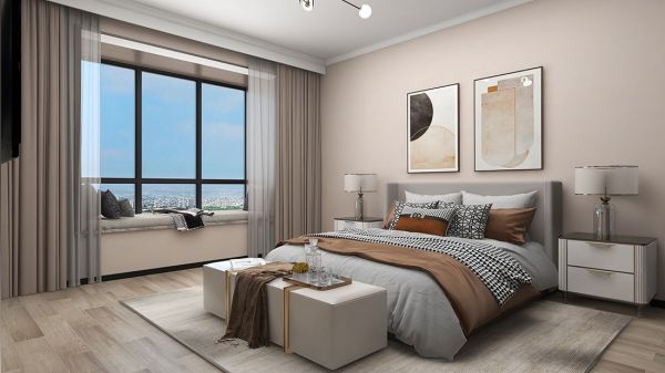 不同于客餐厅与书房的清丽,主卧整体更加温馨。整体暖色系的装饰,不管是藕粉色墙布还还是原木色地板以及棕色系的窗帘等,都让卧室变得更温暖、更舒适。简单的挂画与台灯设计,让空间更为简洁的同时,也让卧室更有格调,更适合睡眠。