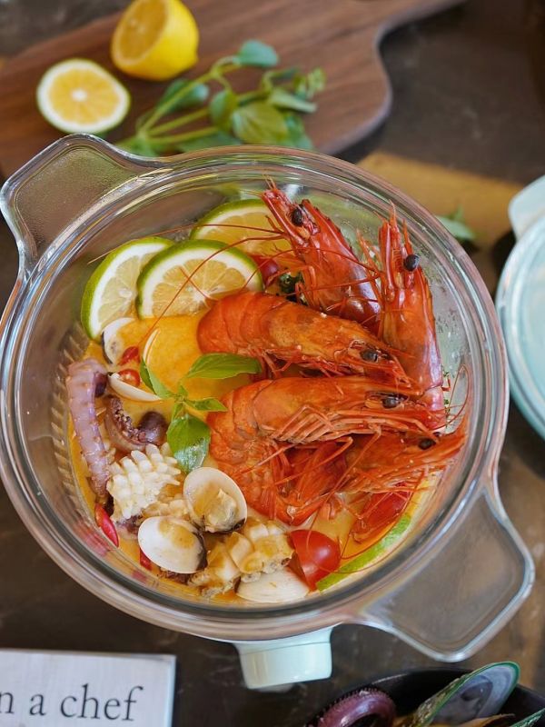 有了东菱养生锅之后,我经常自己在家自制,做法简单,喝起来也非常可口!准备好材料后,在东菱养生锅中加适量水,放入香茅、姜片、柠檬叶和法香煮水。开启东菱养生锅的快煮功能,大约煮20分钟左右出香味后,这时候再放入自己喜欢的海鲜和配料。加入鱼露、椰浆,开启慢炖功能静待半小时,临出锅前挤上柠檬汁,这样一锅香喷喷的冬阴功汤就做好啦~