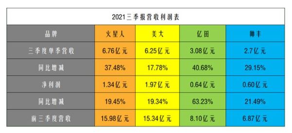 从营收及规模来看,上述4家集成灶企业以及森歌,暂时构成了头部品牌阵营。其中,火星人在多年的追随中不断缩小差距,终于在今年年中实现了营收对老大哥浙江美大的超越,我们预计2021年火星人和美大均能突破20亿元大关,但火星人的增速更快,从半年报到三季报,差距正在拉大。照此趋势,2022年火星人将坐稳营收第一宝座。
