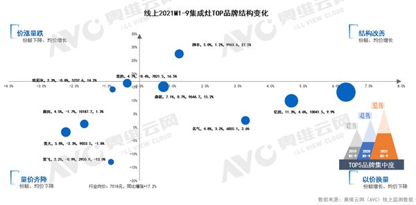 这一点在线上表现的也尤为明显。奥维云网(AVC)线上监测数据显示,截止1-9月TOP品牌结构变化呈现出以价换量的态势,此前价格高位的蒸烤一体集成灶也成为了今年电商价格战的战场。线上的竞争进入白热化,头部企业多以新品策略积累市场。