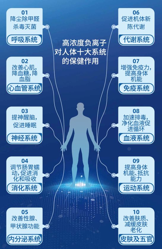 负离子在医学界享有“维他氧”、“空气维生素”、“长寿素”和“降糖素”等等美誉。研究显示,高浓度负离子不仅仅有净化空气的作用,还能对人体十大系统、近三十种疾病具有抑制、缓解和辅助治疗作用,能促进血液循环、促进新陈代谢、增强机体抗病能力、缓解呼吸道疾病、消除疲劳、改善肺功能、改善心肌功能。