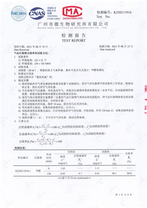 美立方-健康空气卫士的抗新冠滤网对甲醛等生活中常见的污染气体具有降解作用,加上同时释放的亿级高浓度负氧离子,强效分解甲醛等气态污染物,将其分解为二氧化碳和水等无害小分子,使其随气流排出室内,从而达到了彻底有效去除的效果。经广州微生物检测中心检测,美立方-健康空气卫士(大)的甲醛去除率高达99%,持续除醛,新房入住,新添家具,家人更安心。