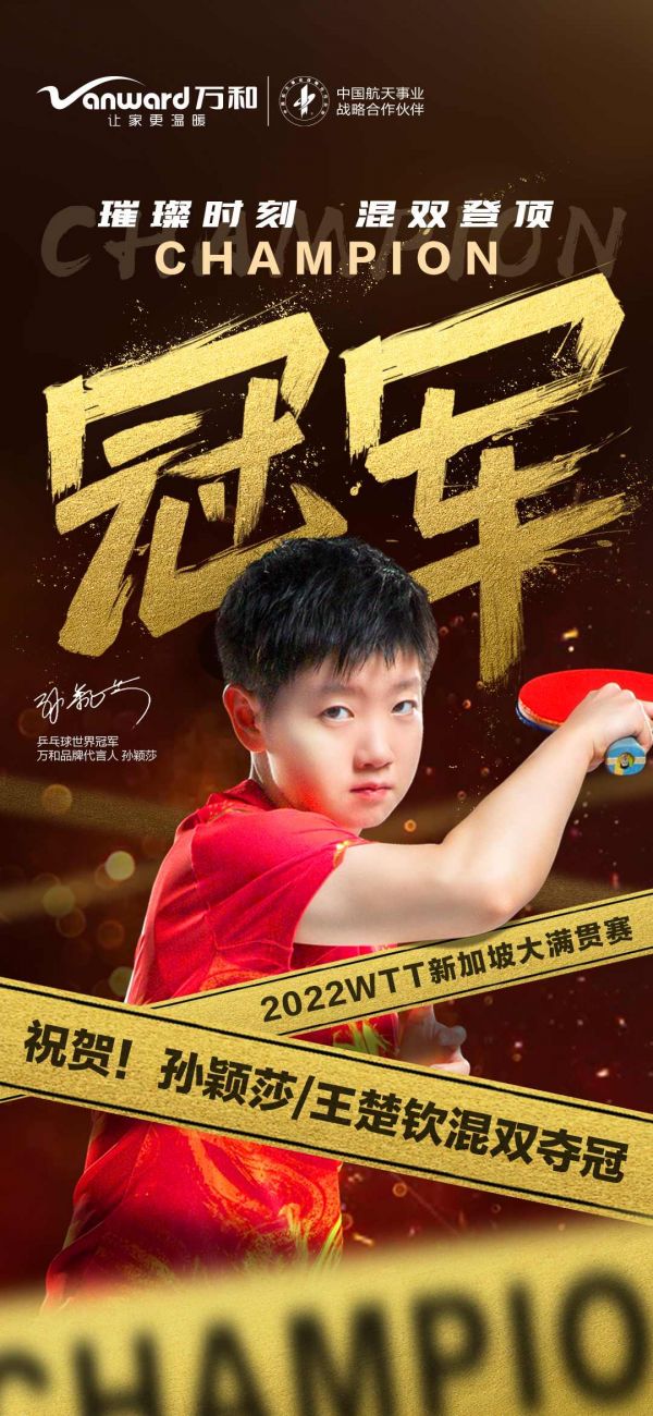 万和代言人孙颖莎与王楚钦夺得WTT新加坡大满贯首个冠军