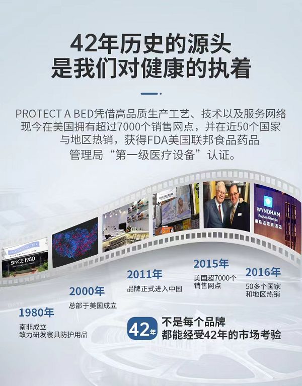 Protect-A-Bed寝之堡母公司成立于1980年,42年来一直专注于研发生产寝具防护用品,产品遍布全球近50个国家和地区,为万千家庭提供了低敏健康的睡眠环境!在家居寝具防护这个赛道上,寝之堡始终秉持着“每张床垫都需要保护”理念,展现出了充沛的活力与非凡的魅力!